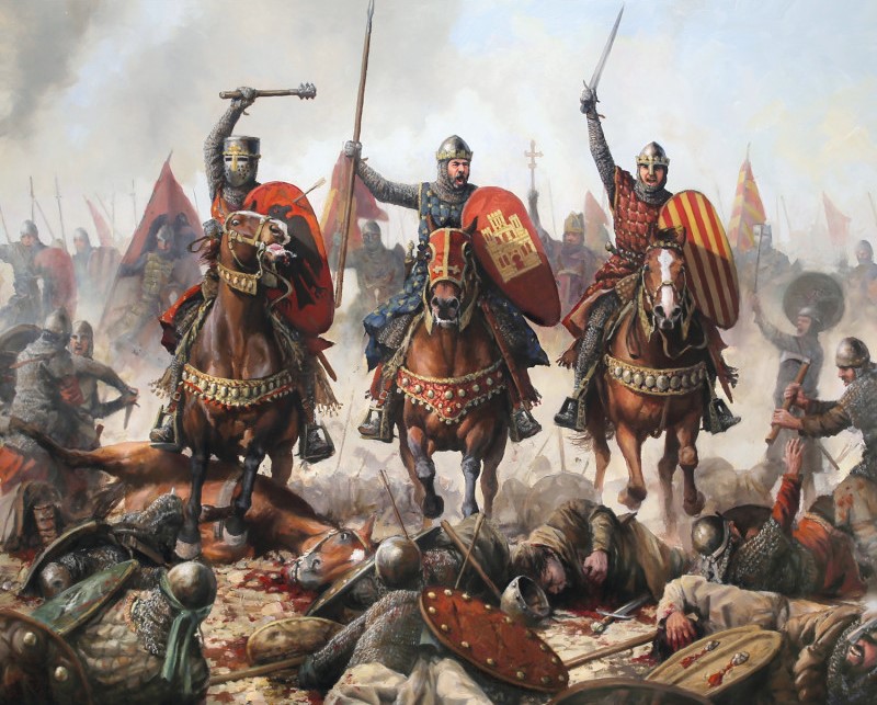A lo largo de los siglos, de norte a sur, las tropas cristianas libraron muchas batallas durante el periodo conocido como la Reconquista. El comienzo de este periodo fue la batalla de Covadonga, donde Don Pelayo derrotó a un ejército musulmán en las montañas del norte de Iberia y estableció el reino cristiano independiente de Asturias. Pero el avance a lo largo de los siglos fue difícil, lento y tortuoso, conquistando grandes extensiones de terreno a los musulmanes y perdiéndolos años después.