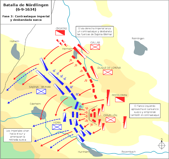 A partir de entonces, lo suecos comenzaron a lanzar ataques sin parar a la colina y todos eran rechazados por los Tercios Españoles que eventualmente se veían reforzados por cargas de la cabellería. En total 15 ataques rechazaron sin apenas sufrir bajas de consideración y mermando y sobre todo agotando al enemigo. Tras estos 15 ataques y con los protestantes ya extenuados, los Tercios Españoles pasaron al ataque. Los suecos y sajones comenzaron a ceder terreno rápidamente y pronto aquello se convirtió en una desbandada. El propio general sueco, Gustaf Horn, fue capturado y los restos del ejército sueco se replegaron en dirección a Heilbronn.
