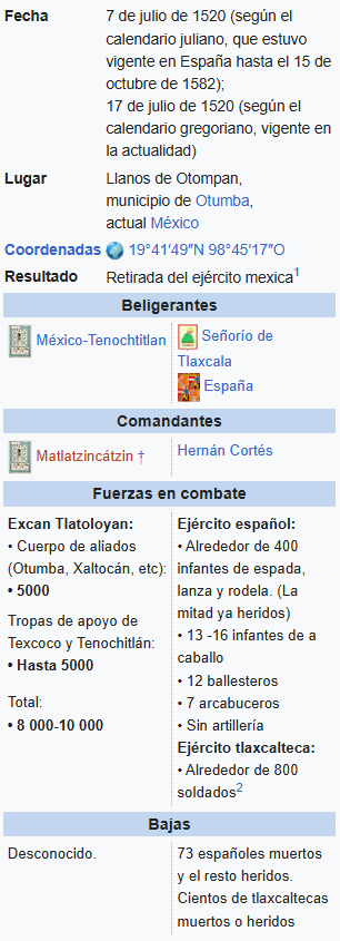 El sábado 7 de julio de 1520, la huida ya no fue una opción. Un gran contingente de guerreros mexicas y sus aliados de Tlalnepantla, Cuautitlán,Tenayuca, Otumba y Cuautlalpan alcanzaron a los españoles en los llanos de Temalcatitlan. La cifra de aztecas allí congregado fue cerca de 100000 guerreros frente a unos 400 españoles y 3000 indígenas aliados.