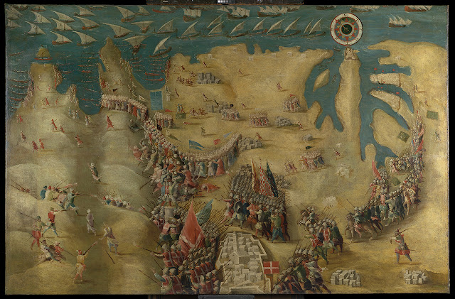 El viernes 18 de mayo se divisó la llegada de la escuadra otomana a unas treinta millas hacia levante. 130 galeras, 30 galeotas, 9 mahonas, 10 bajeles, y 200 caramuzales portaban casi 50.000 efectivos, temerarios aventureros de mar y de guerra que iban a veces vestidos con pieles de leones y plumas de aves rapaces. Traían una gran batería de artillería, municiones y provisiones para seis meses.